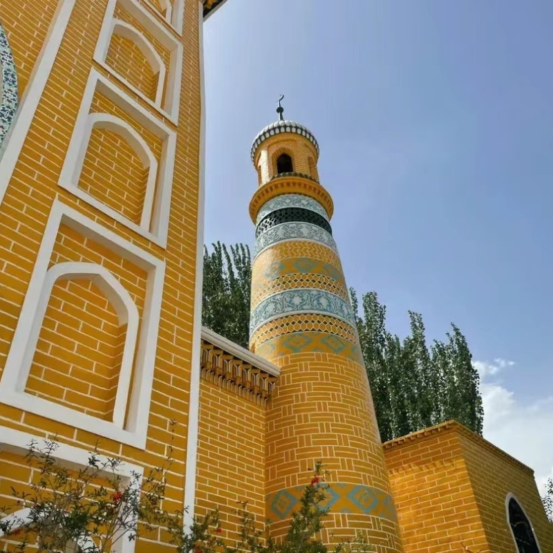 艾提尕尔清真寺:清真寺坐落于喀什市的艾提尕尔广场西侧,占地25.22亩,是有着浓郁民族风格和宗教色彩的伊斯兰教古建筑群。艾提尕尔清真寺是新疆乃至全国最大的清真寺,也是全疆穆斯林“聚礼”之地,周五礼拜的人达5-6千人,“古尔邦”节大礼拜人数可达2-3万人。